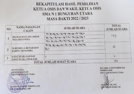 Kedua Paslon mengusung visi misi yang membangun, dengan masa kampanye yang telah ditentukan, terpilihlah paslon nomor urut 1 sebagai Ketua dan Wakil Ketua OSIS SMAN 1 Bunguran Utara masa bakti 2022-2023. Dengan diikuti warga sekolah sebagai pemilih ( siswa, kepala sekolah, guru dan staf tata usaha serta penjaga sekolah) diperoleh rekapitulasi hasil penghitungan suara sebagai berikut: Paslon nomor urut 1 sebanyak 139 suara, sedangkan Paslon nomor urut 2 sebanyak 55 suara dan ada 2 suara yang tidak sah. Jadi jumlah total hak pilih yang menggunakan hak suaranya 196 suara.